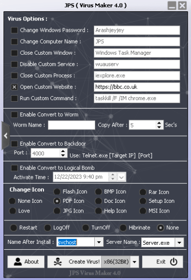 Click the right arrow in the middle to go to the second page and select “PDF Icon” and “Create Virus”. Then click Exit.