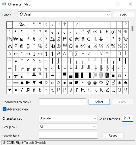 Now, bring up the Character Map tool, click Advanced view and in Go to Unicode, enter and search for 202E. Click Select and Copy.